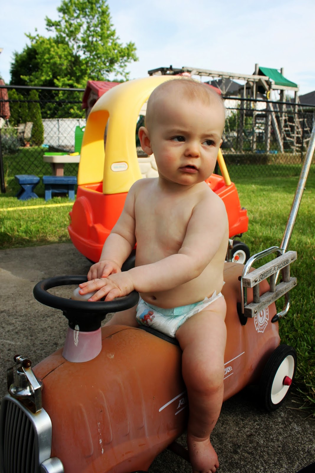 He crawled over to the red car so I put him in. Holy cow, he loves that thing. He was turning that steering wheel like it was nobodies business! Slamming his hands on the wheel.....if it weren't for the smile on his face one might of thought he had a bit of road rage!